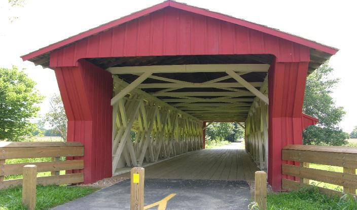 | The Pottersburg Bridge was built in 1868 by Reuben L. Partridge of Marysville, Ohio. Known also as the Upper Darby Bridge, this bridge originally spanned nearly 100 feet over the Big Darby Creek on North Lewisburg Road in Allen Township. This bridge was moved to its current location off of Inskeep-Cratty Road in 2006, where it was renovated as a part of a multi-use path to the village of North Lewisburg in Champaign County. This bridge was replaced by the new North Lewisburg Road Covered Bridge. |